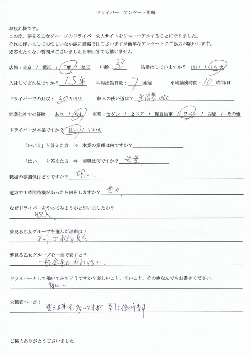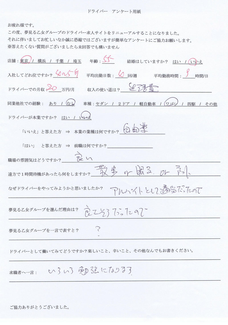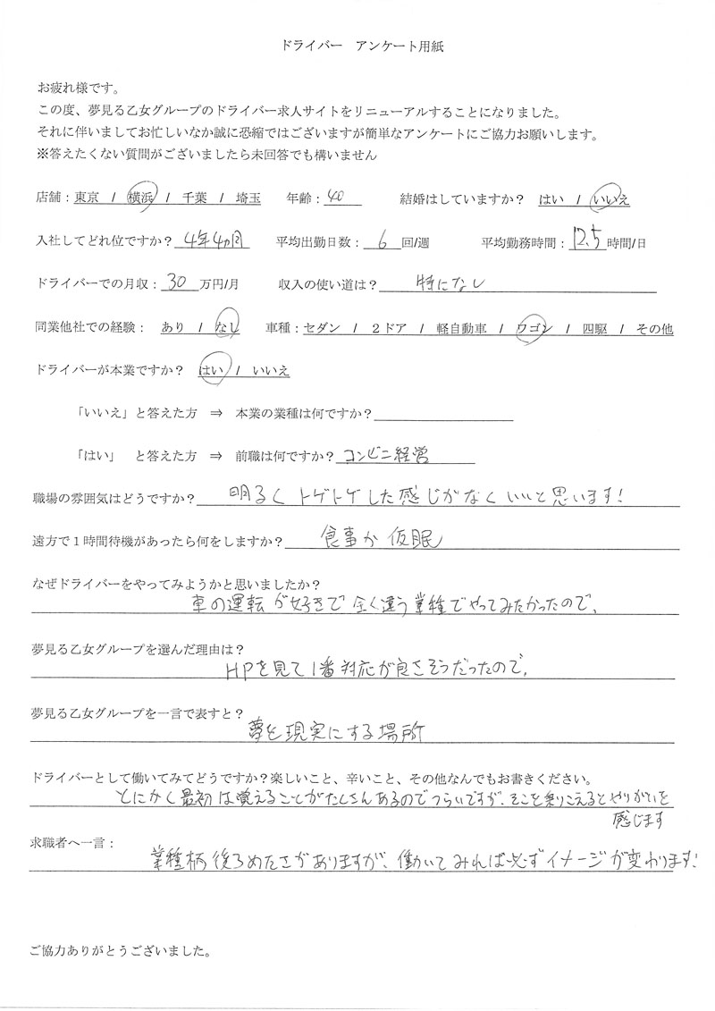 ここまで読んで頂いているあなたは、夢見る乙女グループのドライバーとして働こうか悩んでいる事だと思います。だとしたら、是非勇気を出して面接にお越しください。もちろん面接で話を聞いて辞退する事だって出来るんですから、まずは行動です。掛け持ちでも構いません。学歴や職歴も不問です。未経験の方も大歓迎。