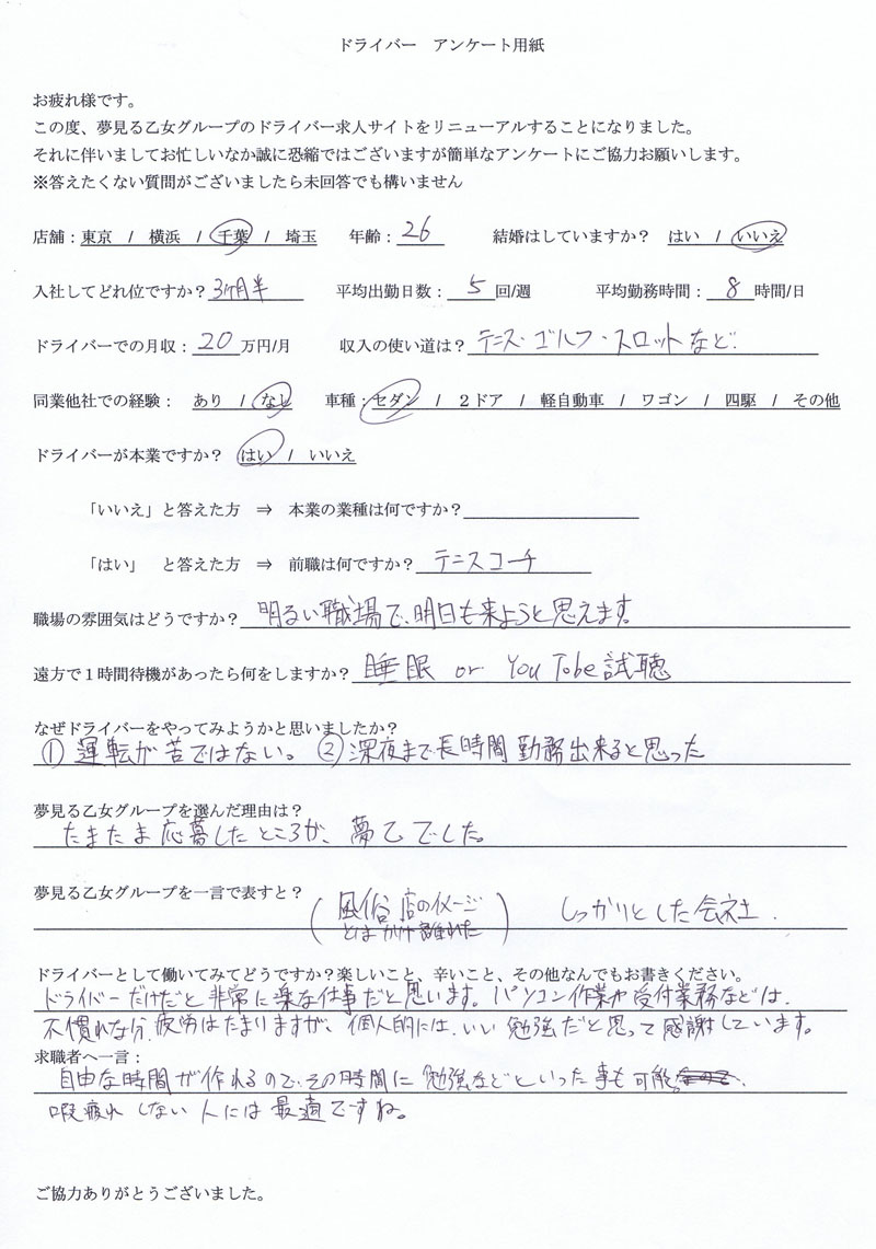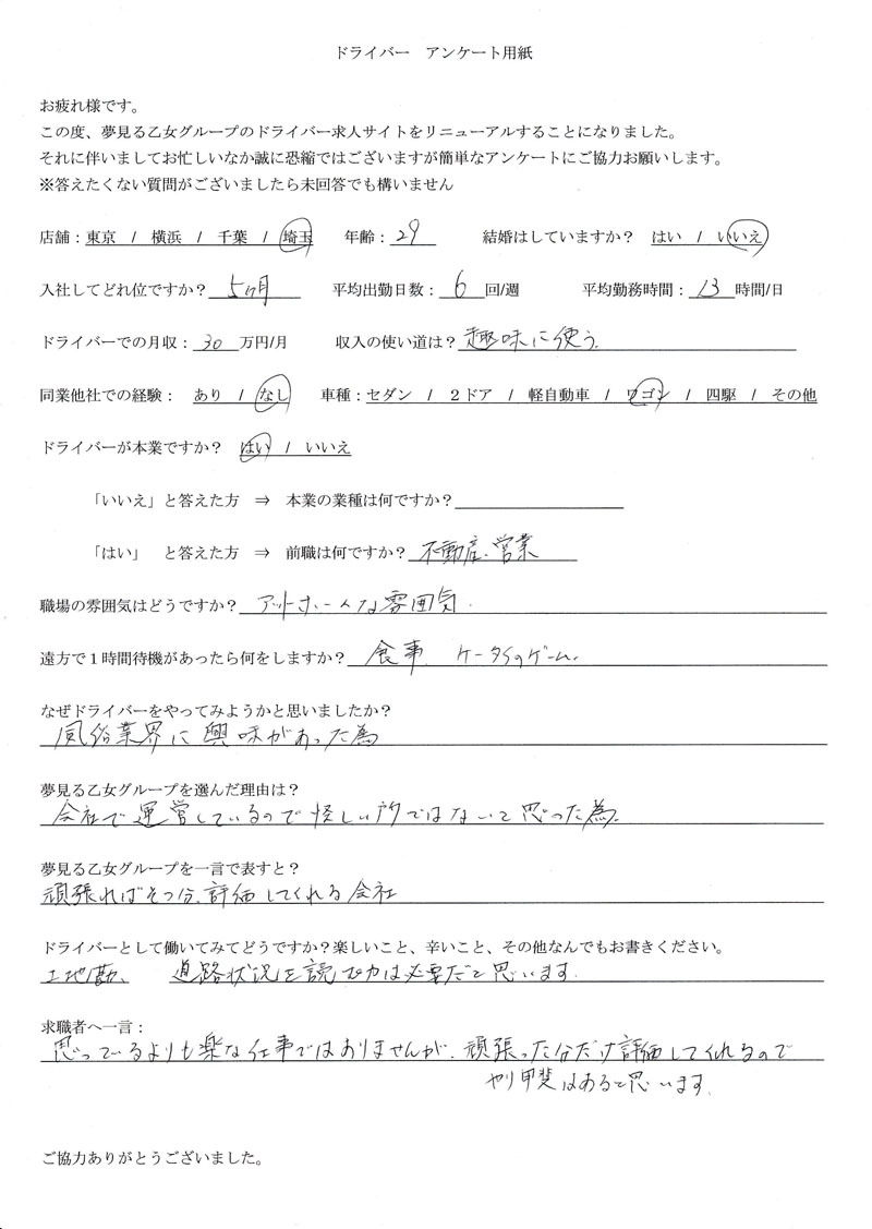私は元々、横浜店のドライバーとして勤務を始めました。当時まだ23歳だった私の志望動機は、「日払いでもらえる」「稼げそう」「女の子がいる」そんなものでした。次の仕事が見つかるまで3ヶ月働ければ良いなーなんて考えでドライバーを始めたのです。